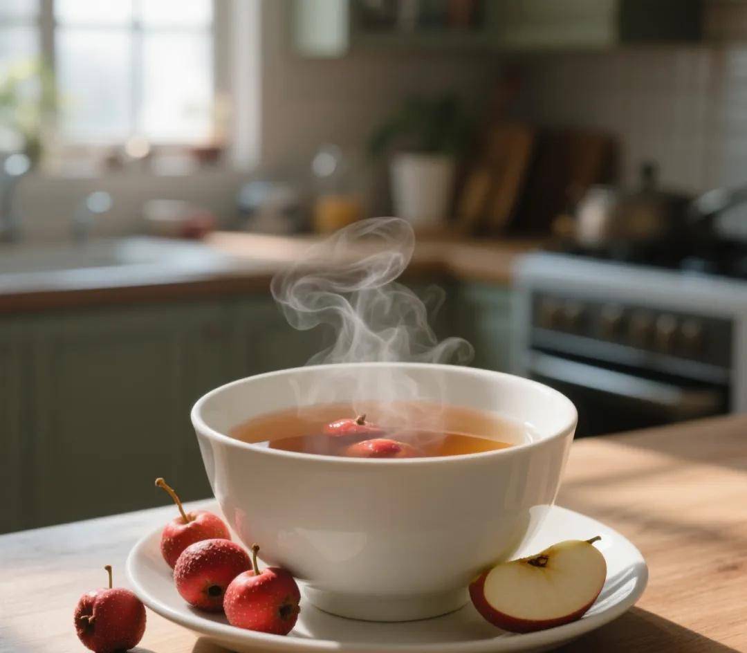 山楂富含有机酸,能刺激胃液分泌,增进食欲;苹果中和了山楂的酸涩,使口感更加柔和。二者煮水,不仅生津解渴,还能化解夏天因暑湿导致的食欲不振。